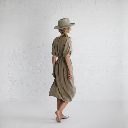 Gathered waist Linen Dress | Green