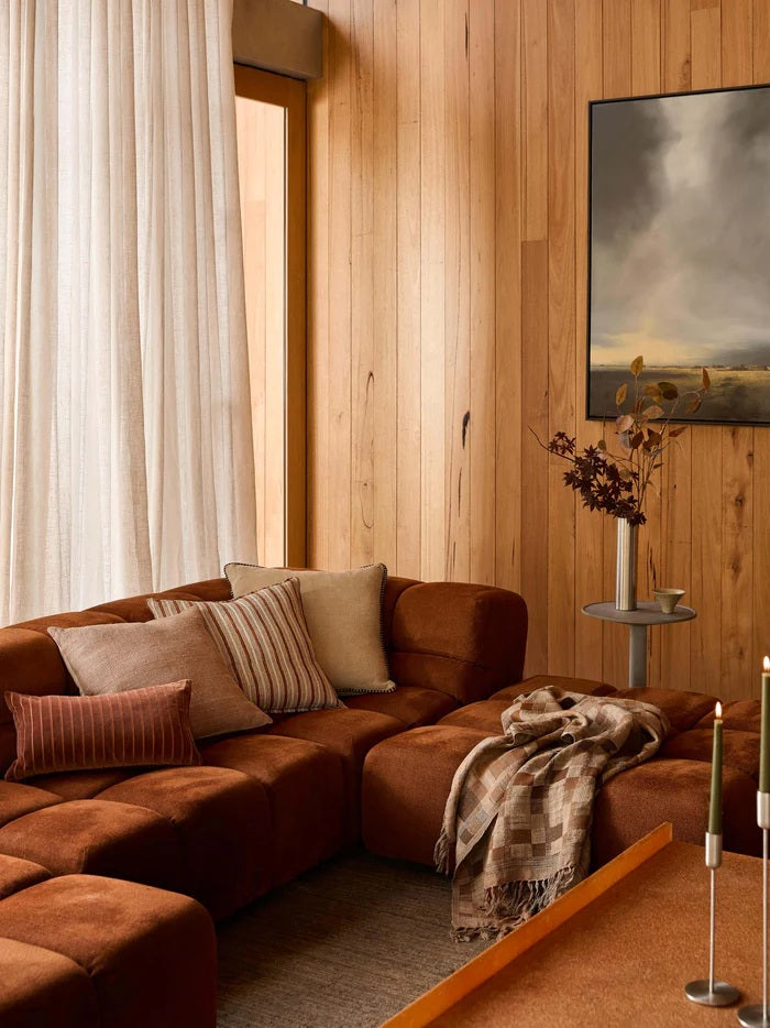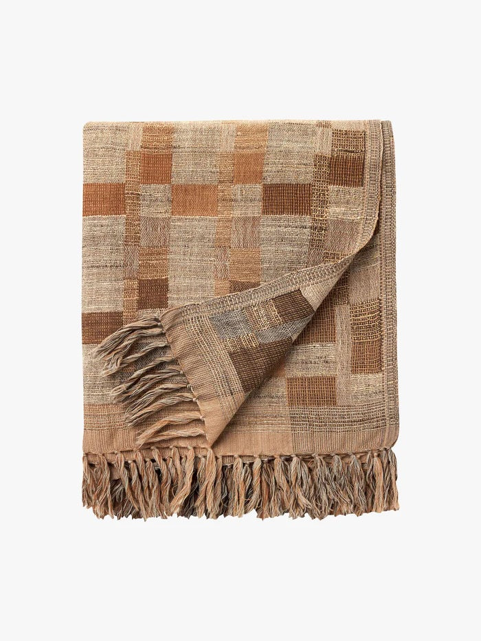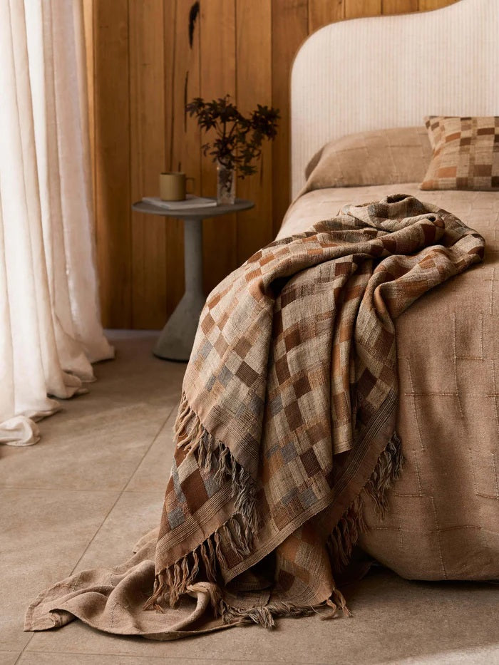The statement, hand-loomed August Throw adds style to any space with its warm, neutral tones and gentle chequered print. A testament to craftsmanship and design, each individual item is hand woven by artisans using ancient techniques.