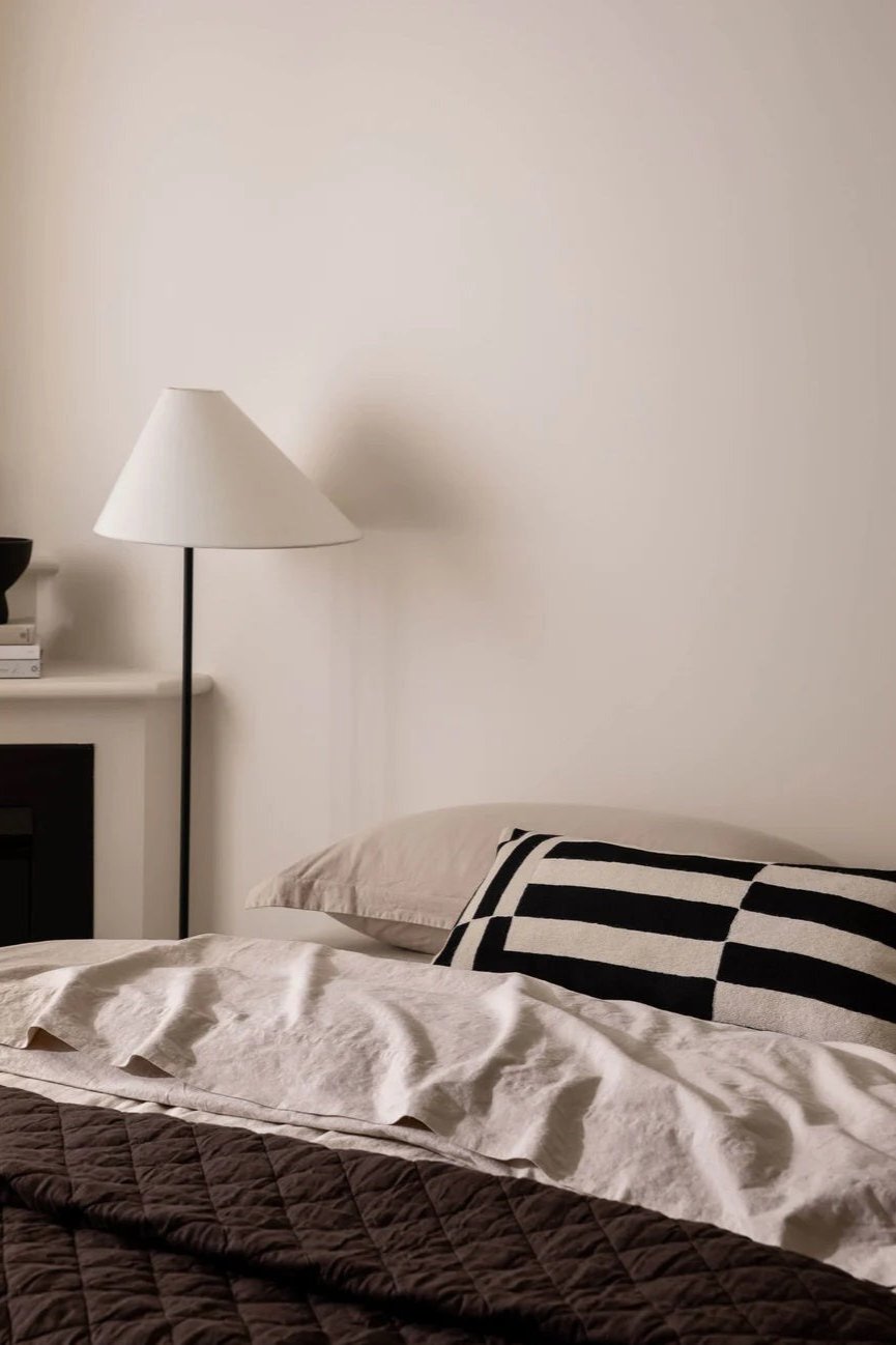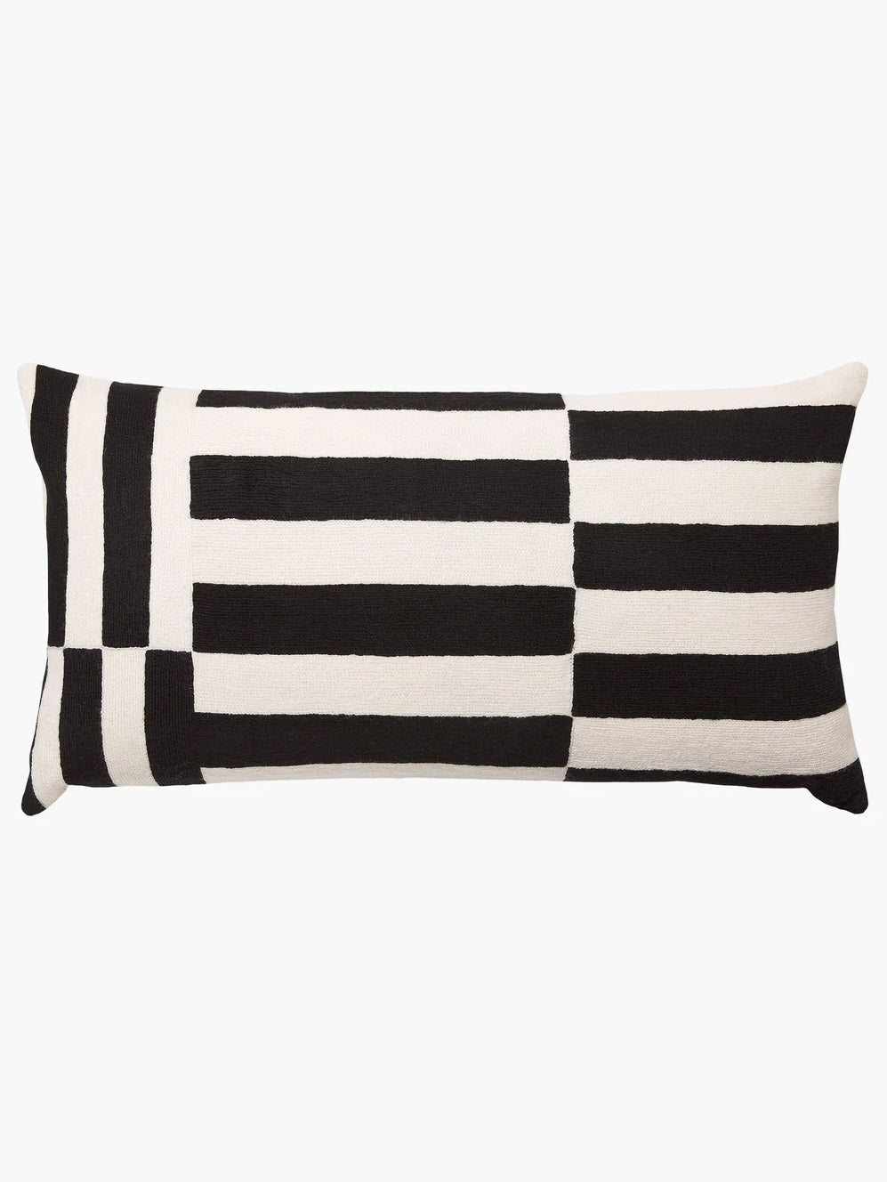 This lumbar cushion features a bold, monochrome design made with a traditional hand embroidered chainstitch technique.