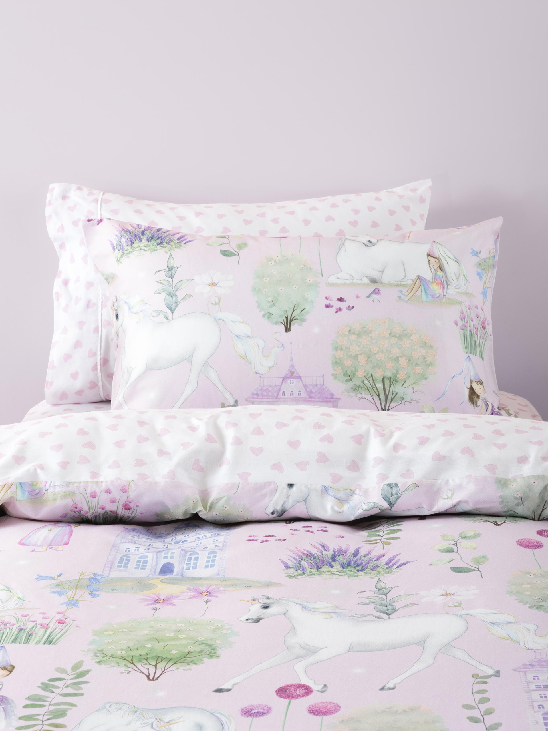 Dream big in a world of castles, crowns and enchanted flowers! In the world of Stardust Garden, princesses twirl beneath pastel castles, and every flower spreads a sprinkle of magic. Set against a mauve, 100% cotton base, this magical escape reverses to a sweet lilac heart print, the perfect match to the coordinating Lots of Love sheeting (sold separately).
