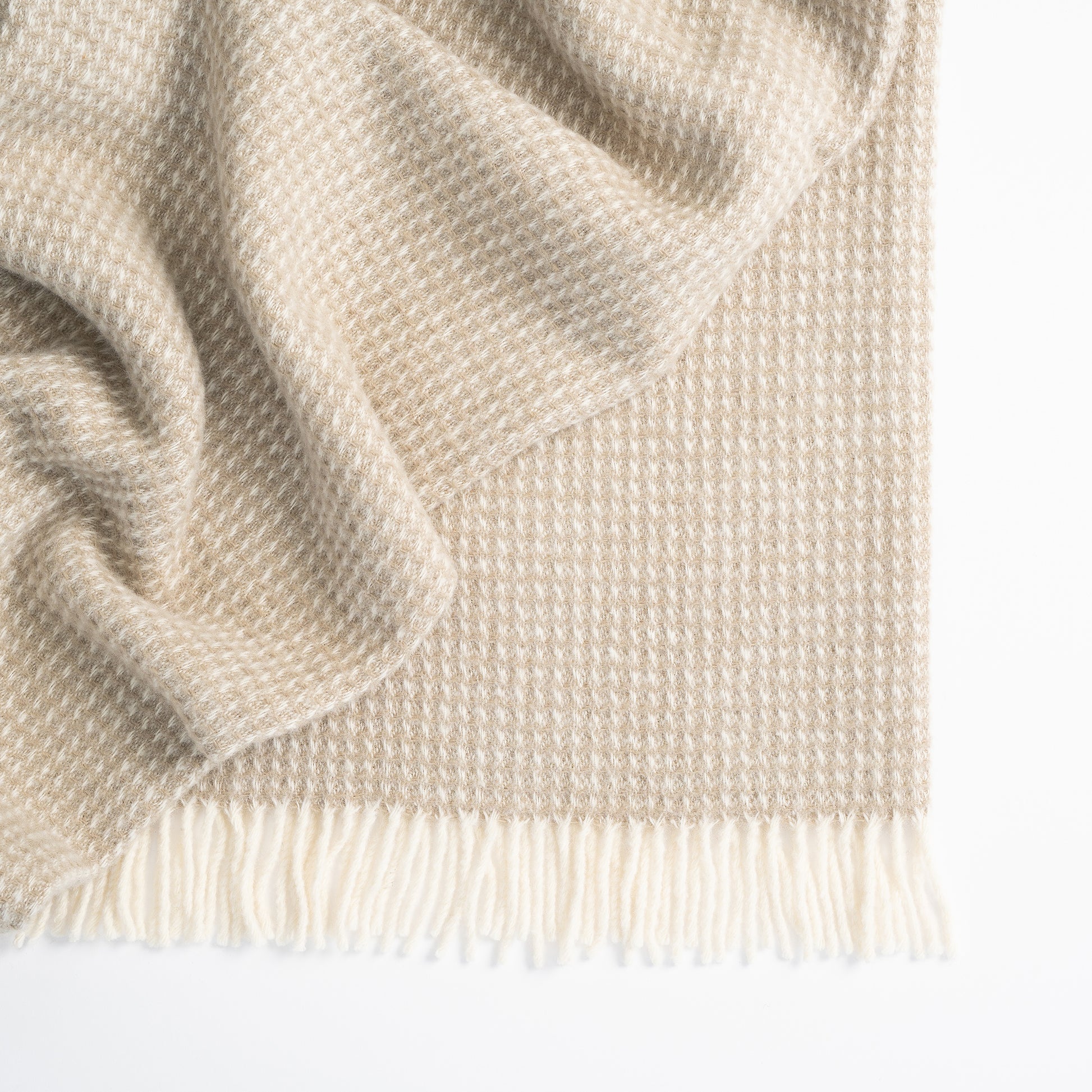 A toasty waffle weave throw blanket woven from 100% New Zealand wool, the Hazel colourway is a warm, nutty, neutral that will pair with most interiors.
