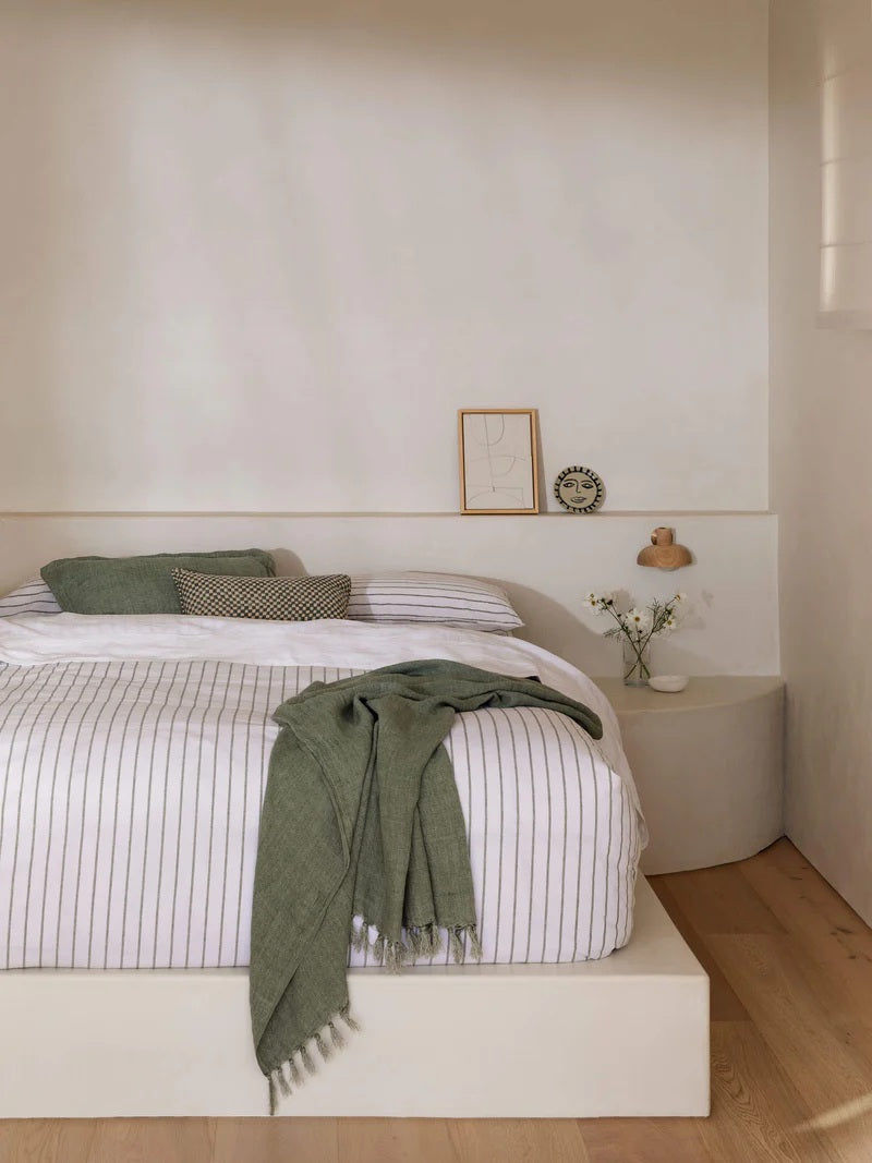 Woven by hand from 100% heavyweight linen, this throw brings raw texture and quiet elegance to any room. Its subtle fringe and rich, tactile weave offer an effortless way to soften modern spaces or add depth to neutral ones. The colour - a muted seagrass green, evokes stillness, grounded luxury, and a deep connection to nature.