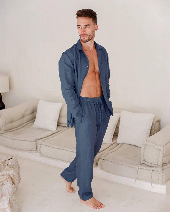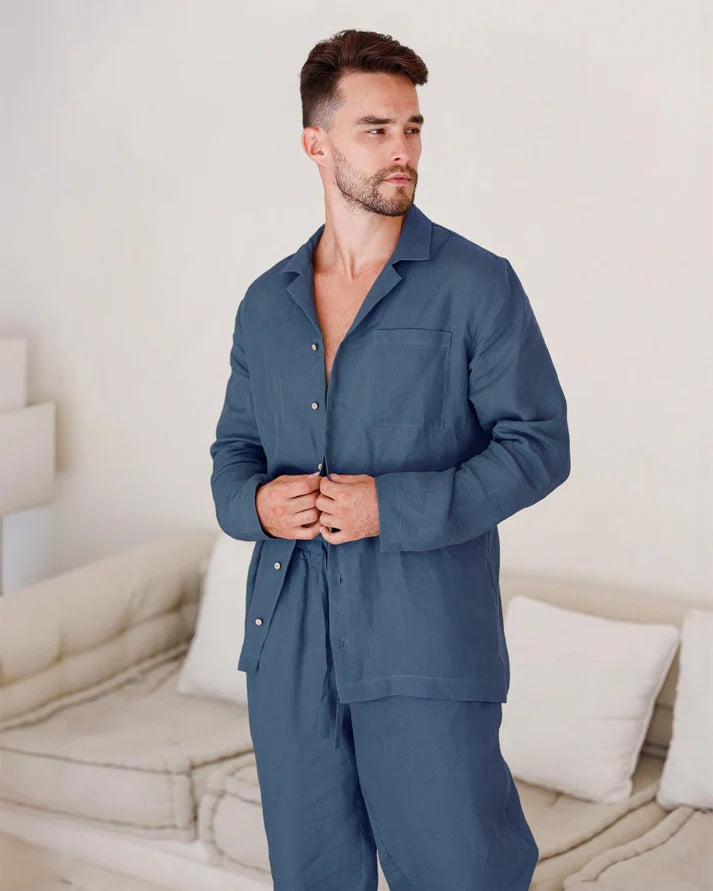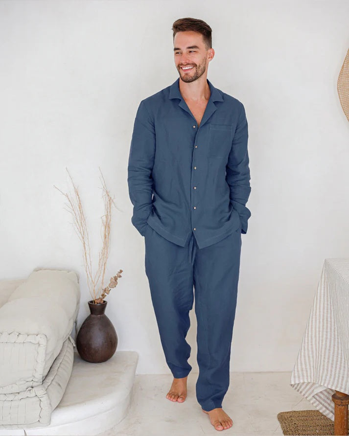 Linen dreams. Our 3/4 sleeve linen pajama brings more quality to your sleep routine. Linen fabric is very gentle for your skin and lets it breathe throughout the night. This linen pajama is designed to have a loose fit, pants have an adjustable waistline so you can make it tighter or looser and the top has a button closure in front.