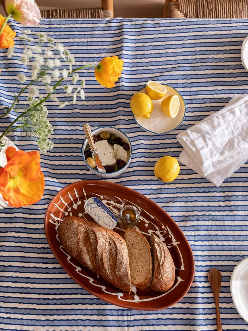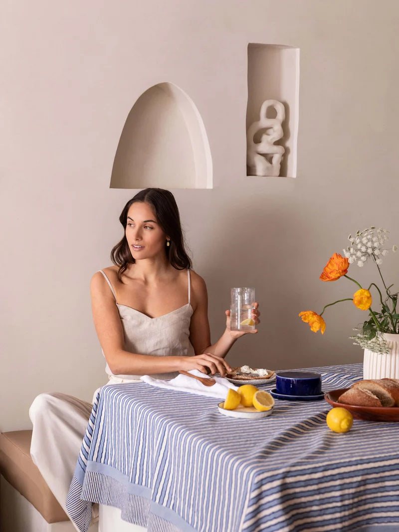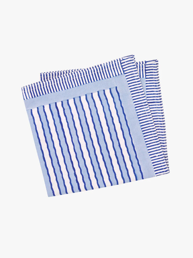 Elevate your table this season with our beautiful, hand block printed Algarve collection. Hand-crafted by highly skilled artisans, this painterly striped design sets a stunning foundation for everyday dining and summer entertaining.