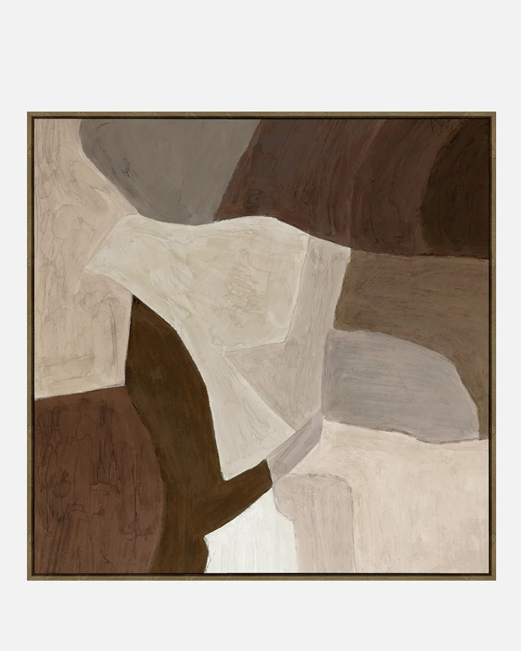 This abstract piece combines soft, overlapping forms in warm neutral shades of brown, beige, and cream. The flowing shapes create a sense of depth and quiet movement, offering a soothing and timeless visual presence, a perfect addition to a serene, modern space.