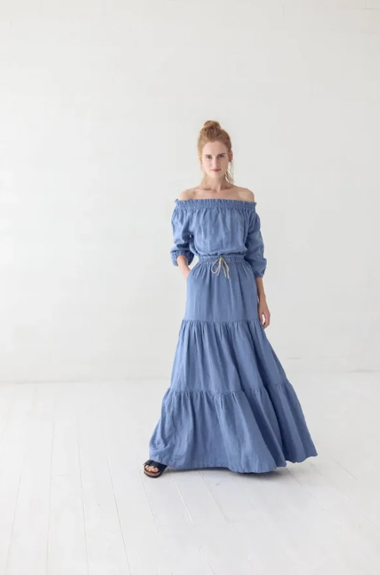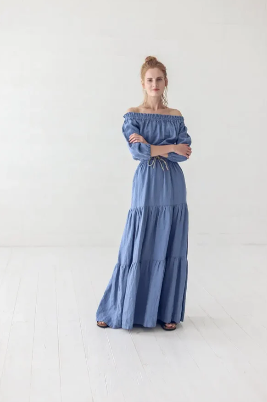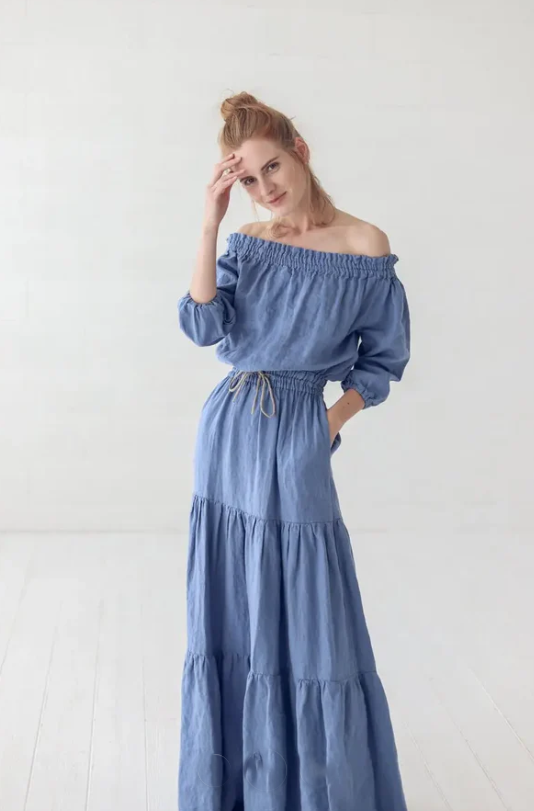 This lovely linen dress features an off-shoulder design, ruffled layers, side pockets, and a fitted elasticated waistline with a charming natural linen twine tie belt. It's an ideal choice for ladies who appreciate a romantic and feminine style.