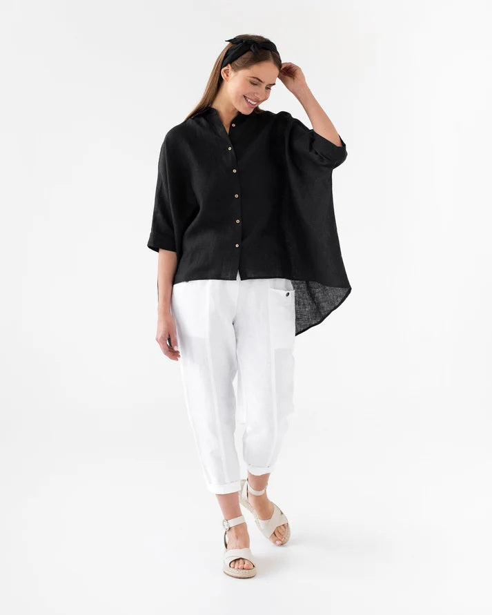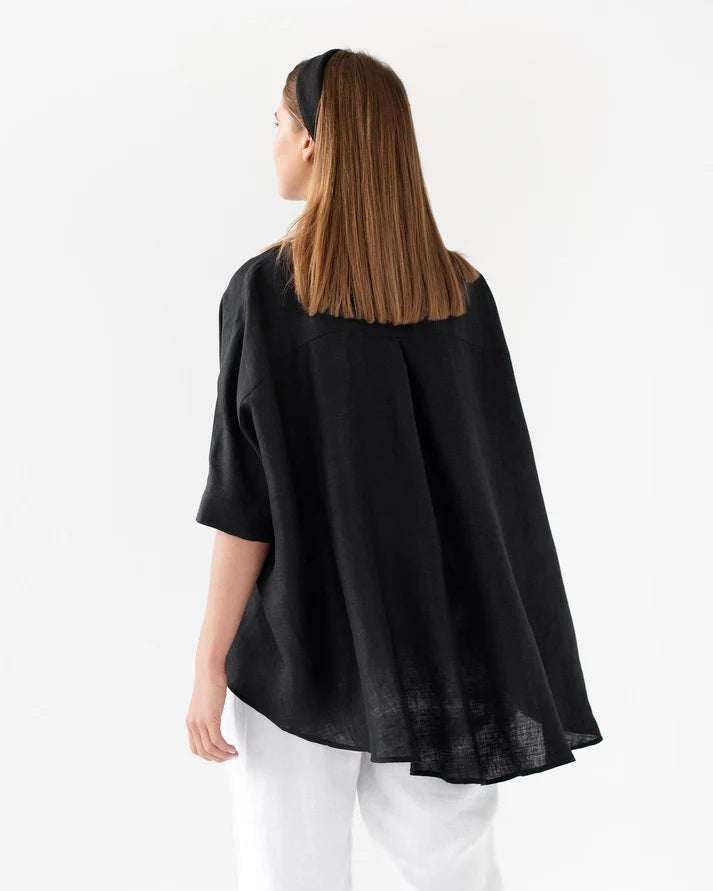 Oversized shirt type blouse crafted from lightweight linen. With an asymmetrical hem that's longer at the back, dropped shoulders, and short sleeves, fastened with buttons for a stylish touch. A true wardrobe staple