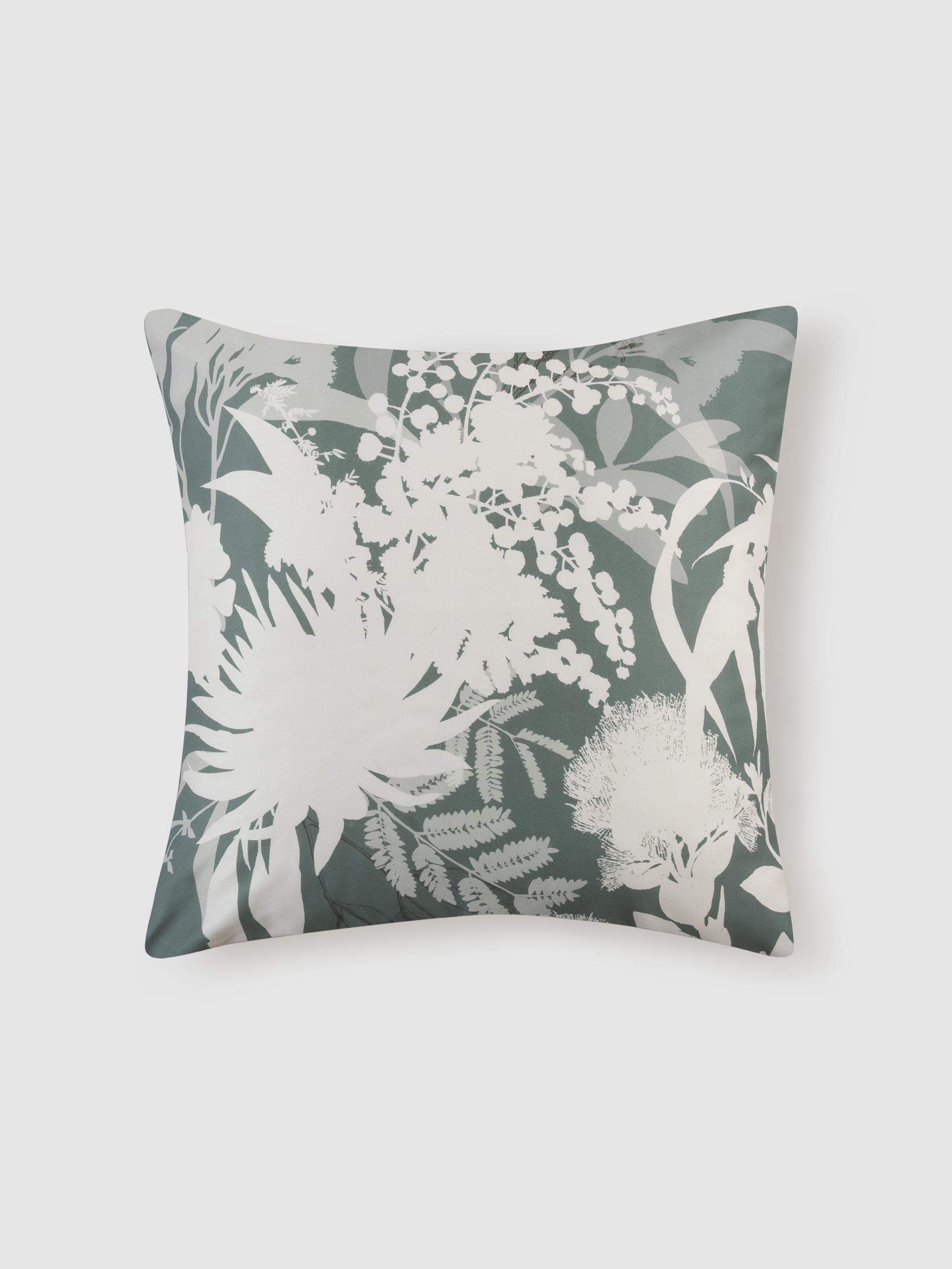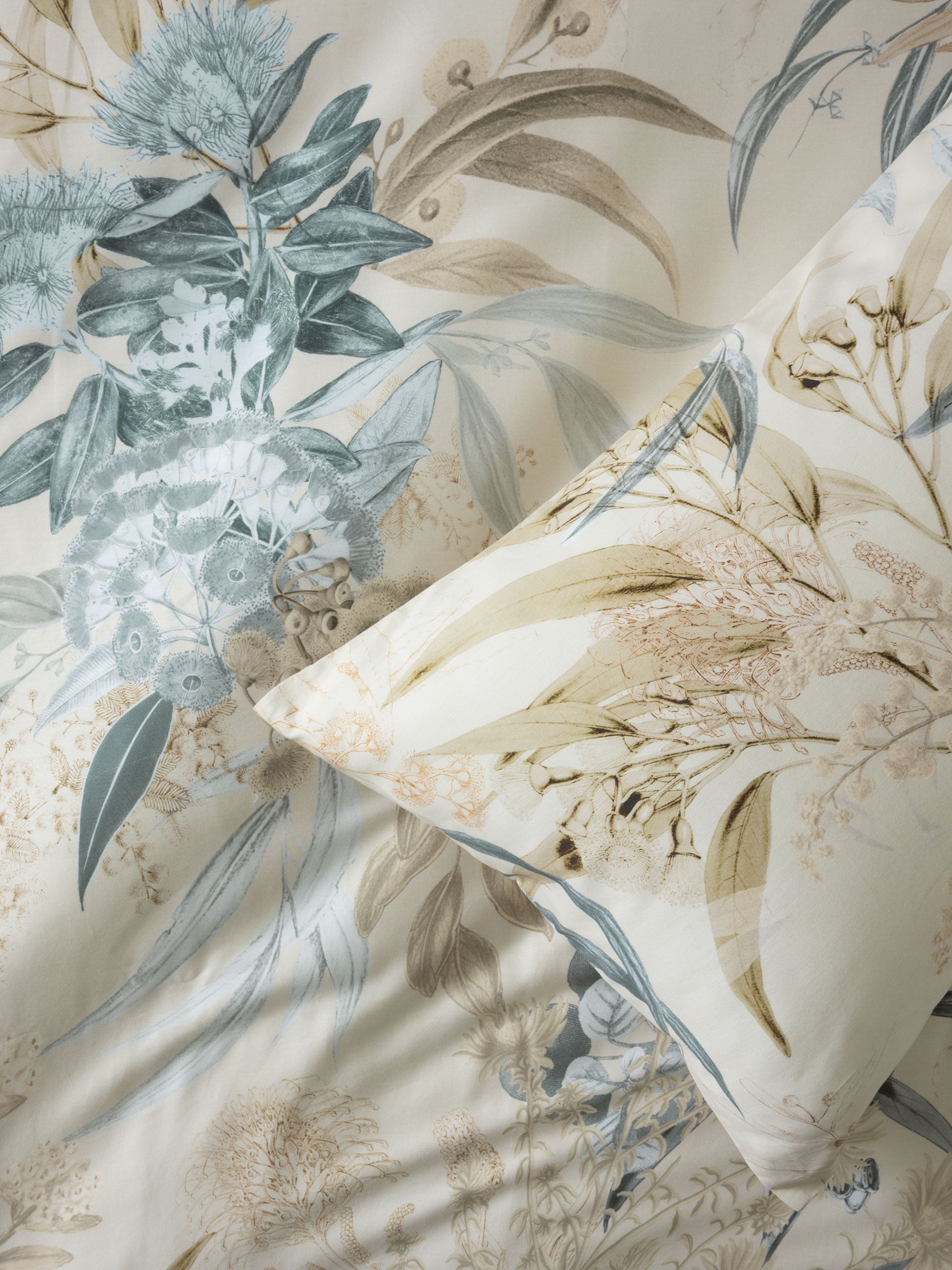 Bring the serene charm of botanical landscapes into your bedroom with Sorrento. This beautifully detailed print captures native flora in a soft, earthy palette of eucalyptus green, teal and gold, layered across a warm, natural base. Printed on smooth cotton sateen, Sorrento offers a calming statement when paired with the coordinating European pillowcase.