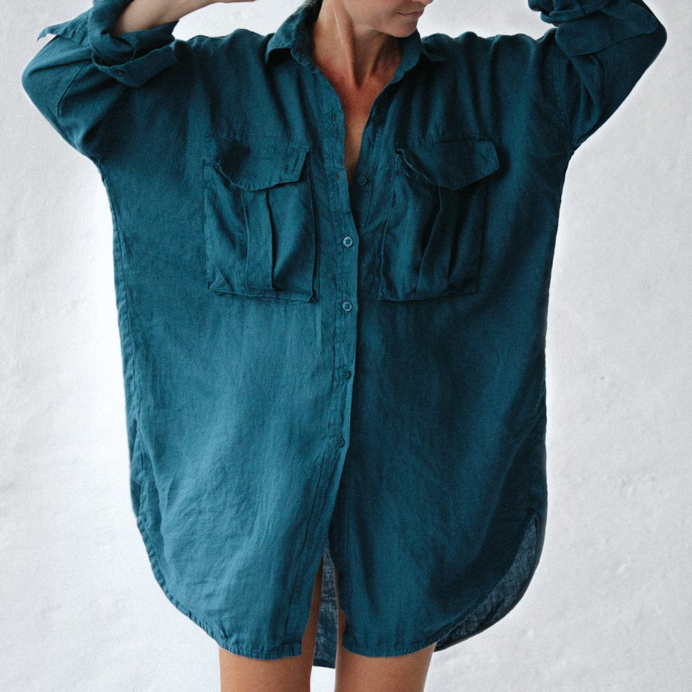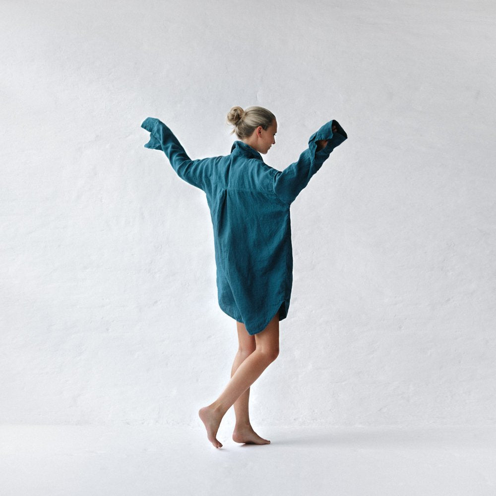 Crafted from breathable Baltic linen with a relaxed silhouette, it’s made for lingering in bed, making late coffee, and curling into corners with a book. Buttoned up or worn open, over sheets or swimwear — it always says the same thing: I’m exactly where I need to be.